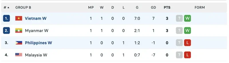 Trong khi đó, Nữ Philippines lại bất ngờ thua Nữ Myanmar 1-2 trong trận đấu mở màn.